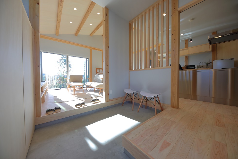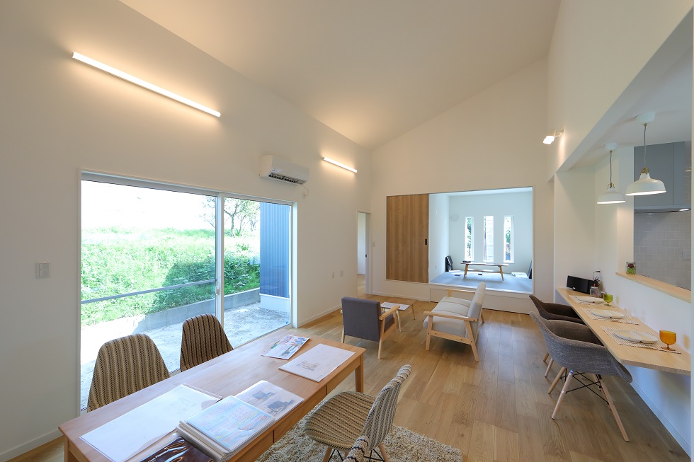直線でつながる家事動線の平屋 小上がりの和室やキッチンカウンターが家族の時間に抑揚をプラス…