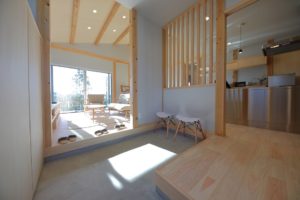 家族が過ごすリビングは桧の香りと畳敷きでくつろぎの空間を演出。家の中心の中庭から降り注ぐ太陽の光で家中が明るく、家族の生活を彩ります。